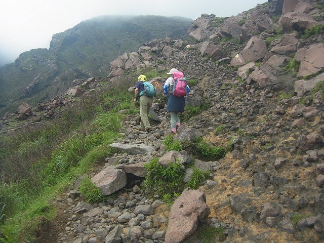 ゴツゴツした火山岩に塗られたペンキの印しに従い、30分も登ると、オーバーハングにぶつかる。此処を右に巻いて避けながら登って行く。次第に霧の中を歩く様になる。歩き始めて2時間10分で稜線に出ると風に吹かれる。傍らを見るとマイヅルソウが少し群生しているが花はまだか、葉だけを眺める。此処から右折れして、霧の中を高岳、中岳となだらかに歩く。中岳に着いても霧は晴れず、何も見えないので"火口東展望台"の方へは向かわず、一,二分戻り、左の仙酔谷へと下る。間もなく、下界の視界は効き、左下に舗装された歩道が有り、途中に避難壕が見える。更に右少し下に廃線になったロープウエイの駅が見える。それを目指して下り、駅には一寸登り舗装された歩道に出てから駅に着く。