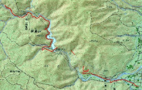 | 登山道 □は山頂、登山口、桂谷分校跡、駐車場 |