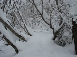 | 藪の中の雪道 | テープを確認して進む | 鹿の角のような雪 |