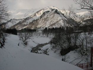 | ここから歩き出す | 梅花皮荘対岸から西俣ノ峰 |