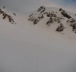 | ホン石転ビ沢出合を振り返る | 雪崩跡に新雪が被さっている |