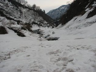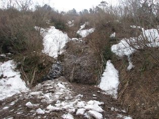 | 梶川出合の水場 | 梶川出合上も雪が窪んでいる |