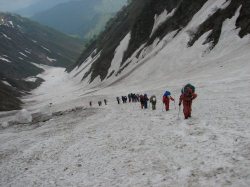 | 安全な所で休憩 | いよいよ雪渓を登る | 荷物が肩に食い込む |