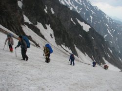 | 滑らないように注意して | 雪渓の状態は良くない | 崩壊地の上を高巻いた |