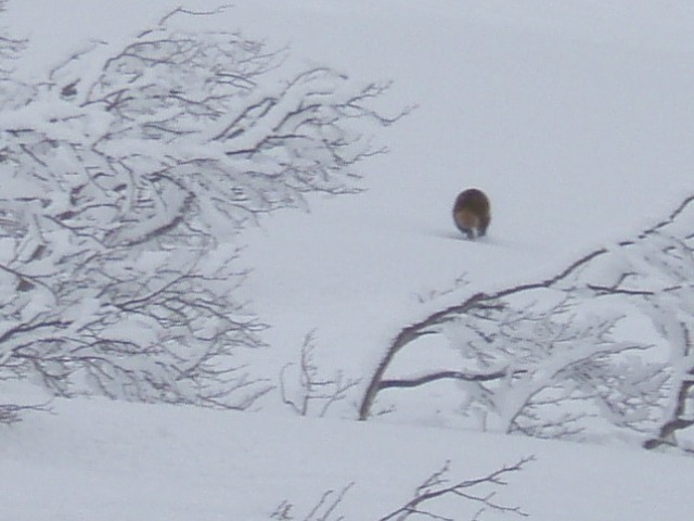 1,153m09:50三体山々頂の一角に入る。平坦で灌木に覆われた山頂部で柱を見つけた。ここが山頂だろう。セルフタイマーで記念撮影をしていると、灌木が動く気配がした。目を向けると大きな丸々とした動物が目の前を歩いている。距離は6m位だろうか。慌ててカメラを出すと走り出し、灌木の陰で動かない。近づくと次の灌木群に走る。夢中で何枚かシャッターを切り、ザックから望遠用のカメラを出したが、何とバッテリー切れで作動せず、残念。