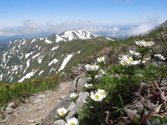 北股岳山頂では大日岳を撮り、それから下って行くとミネザクラが満開である。ギルダ原周辺ではハクサンイチゲ、ミヤマキンバイが咲いている。これ等を丁寧に撮っているので、先行の人達は見えなくなる。門内岳の先では数年前の光景が再現していて、ハクサンイチゲとミヤマキンバイが共演していてやたらに、シャッターを押す。但し残念ながら、バックにする予定の二王子岳が雲に覆われている。稜線には小振りのシラネアオイが時に咲いている。