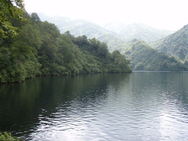 13:07水場の標識、水場は右へ下るらしい。13:11石を敷き詰めた歩道で歩きにくい。石は丸まっているし異質なものもある、空輸したものだろう。潅木帯に入ると、所々に丸太で作られた階段が続く。13:30ブナ林に入る。13:35湖面が見えた。13:43直登コースと合流する、すぐ水門となる。 13:47タキタロウ山荘の水場でアンパンを食べる。14:16吊橋を通過する。15:00車道に出て、15:02車に到着する。