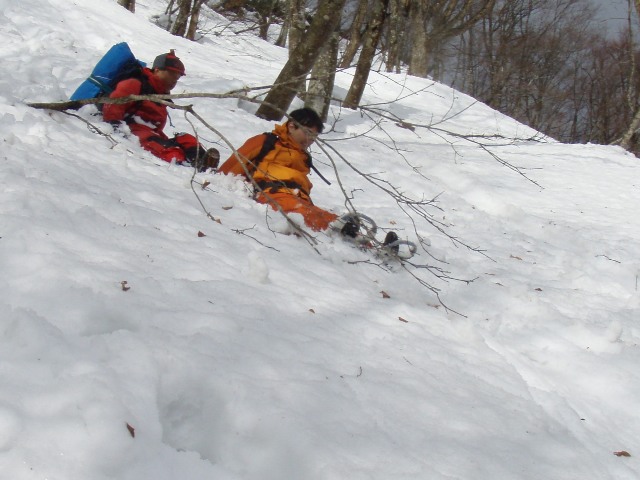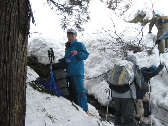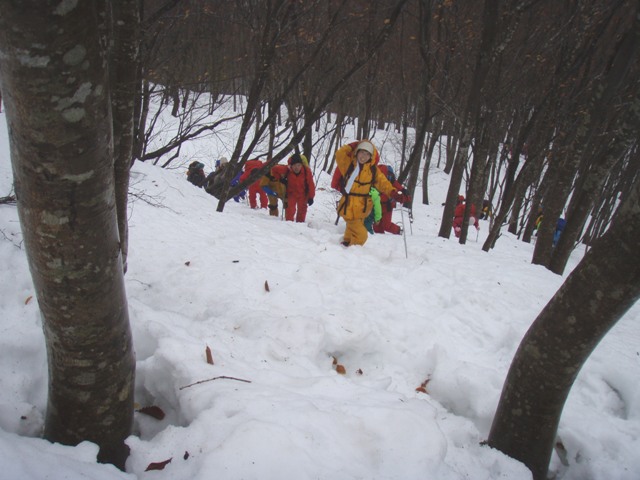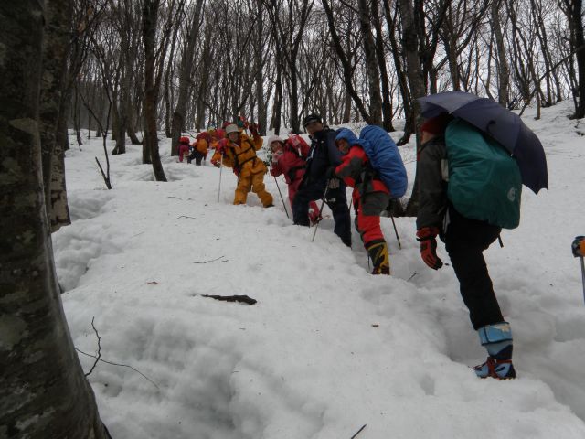雪が少ないので山頂には藪が出て穴が掘れない可能性がある。前日に実踏を行って大まかなプランを作り、5間×4間のブルーシート2枚を中心に準備した。実際には登頂直後に数本のブナに20mのロープを張る。ここを一線として風下側を50cm程度掘り下げ、その雪をブロックにして風を防ぐ壁とした。次にブルーシートを広げ一端を風避けブロックに垂らして雪を乗せた。ブルーシートで会場全体を覆うように広げ、ロープで潅木等に縛り付けた。このままでは天井が低いので、みんなのストックをつないで長くし、下を雪に埋め先をブルーシートの穴に固定した。
