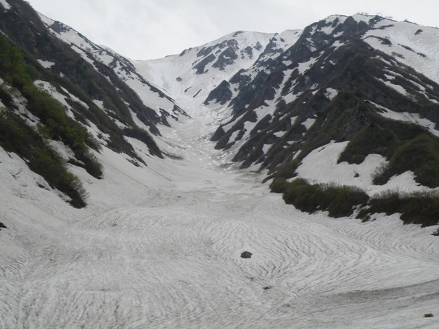 雪渓は滝沢出合手前で出てくるが、途中でなくなるので素直に登山道を歩くのが良い。また赤滝下から雪渓が続くが、ここも崩壊が予想されるので夏道が良い。たんてきに言えば、石転ビノ出合までは全て夏道を歩くのが良い。