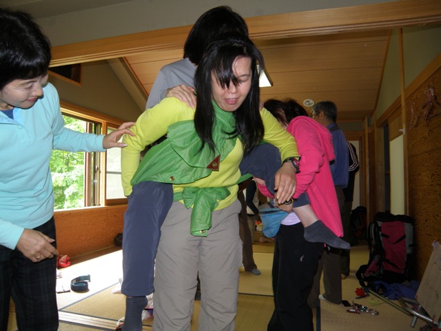 | 女性陣が考え出した、クライミングテープによる搬送法 |