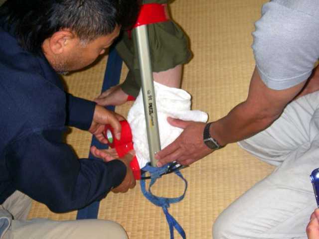 | ピッケルを使った捻挫処置法です、本番では靴を履いた状態で行います |