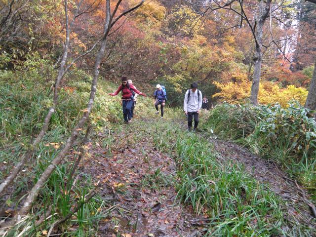 正面の左岸を進み、2本の丸太を渡り、水路沿いに進んで右の杉林に入る。課題の湿地はやはり沢山の人が通っただけに泥濘になっていた。尾根に取り付き、途中の水場直前で休憩。風に舞う大量の枯れ葉のお迎えをいただく。