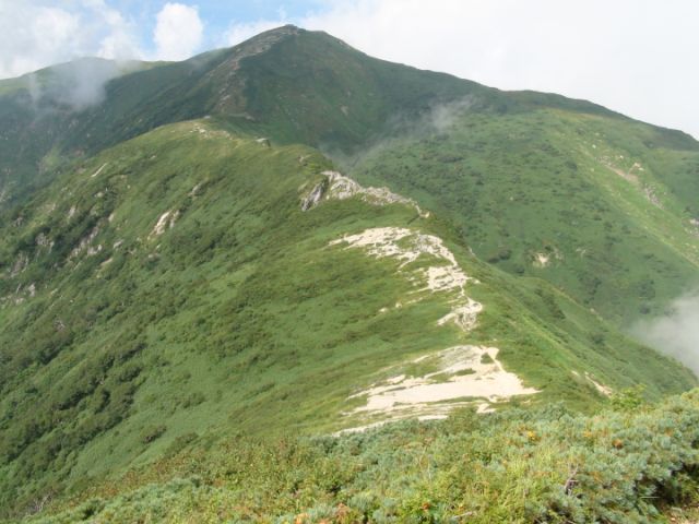6:15川入・御沢キャンプ場〜6:25表参道道標。(遊歩道・登山道分岐)〜6:55下十五里〜7:15〜20中十五里(休憩)7:40上十五里〜8:00笹平〜8:20横峰〜8:35地蔵分岐〜8:45〜55地蔵の水場(休憩)〜9:45剣ヶ峰〜10:10〜20三国小屋(休憩)、ガスっていて本山見えず〜11:00七森〜11:25種蒔〜11:45大日杉分岐〜11:55〜12:20切合(昼食休憩)〜12:55草履塚〜13:15姥権現〜13:25御秘所〜13:45御前坂〜14:15一王子〜14:25〜45本山小屋(休憩)イイデリンドウは終わっていた〜15:00飯豊本山〜15:20駒形山〜15:35玄山道分岐(弘法清水に降り休憩)〜16:25御西〜16:35御西小屋。夕日が綺麗でした。それに、エリンゲ形の入道雲も見られました。ただ、夕暮れ時のブヨの大群には参りました。夜は、星空も大変綺麗でした。