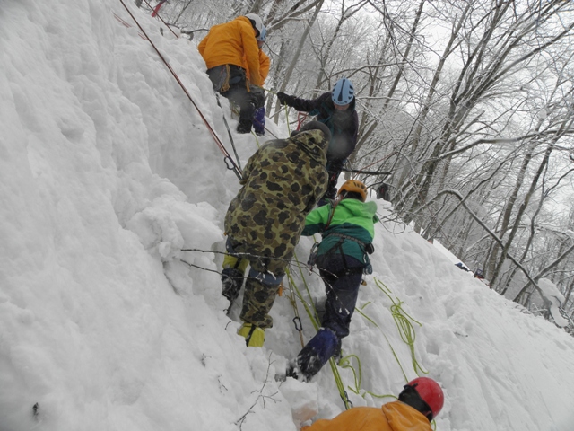 | A班は、背中を押されて転倒し、ピッケルストップ(滑落停止)から始まりました |