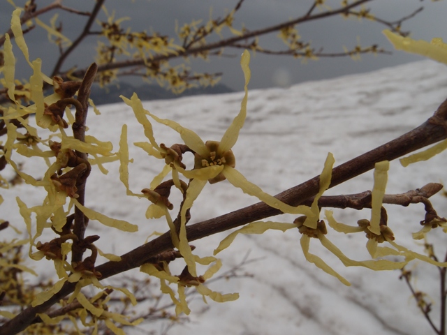 09:37大淵に車を置き林道を歩くが、梅花皮荘から来る橋を過ぎた場所がブロック雪崩危険。09:59登山口から登り始める。ショウジョウバカマ・カタクリ・イワウチワが咲いている。10:37展望地を過ぎると雪の上になる。10:46標高550mで急登は終わる。11:00主稜の分岐で休憩、ここから夏道になるが、鞍部から再び残雪が出てくる。夏道と雪道を交互に歩き、11:33倉手山々頂に到着した。