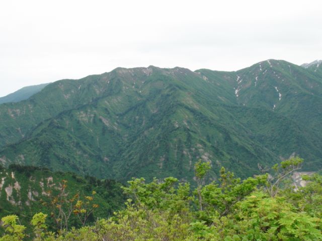 6:10萌葱色の新緑の登山口を歩き始める。少し歩くと、パラパラと雨が時々当たってくる。しかし、本降りにはならない。沢沿いの登山道を15分ほど歩くと最初の琴沢を渡る地点となる。6:25琴沢を、跳び石を使い渡る。水量は少ない。渡ると、斜面のへつり道を気を付けながら歩く。右下は、琴沢である落ちると大変である。暫く登り、再び琴沢を渡る。琴沢から離れるが沢音は聞こえている樹林の中を行く。7:10登山道脇の沢に雪が残っている。登山道も雪で覆われている。少しばかり、雪の上を歩く。