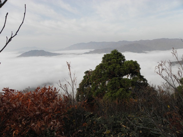 06:54-56左岸に「山頂まで1時間」の標識あり、水を汲み沢から離れる。このコースの迷わないポイントは、この標識を見逃さないことだろう。いきなりロープが下がって、天然杉の生育している急な尾根をぐんぐんと登る。7:25傾斜が緩くなる。道刈りは丁寧にされている。下界は雲海に覆われ、頂上手前の大きな杉が印象的である。