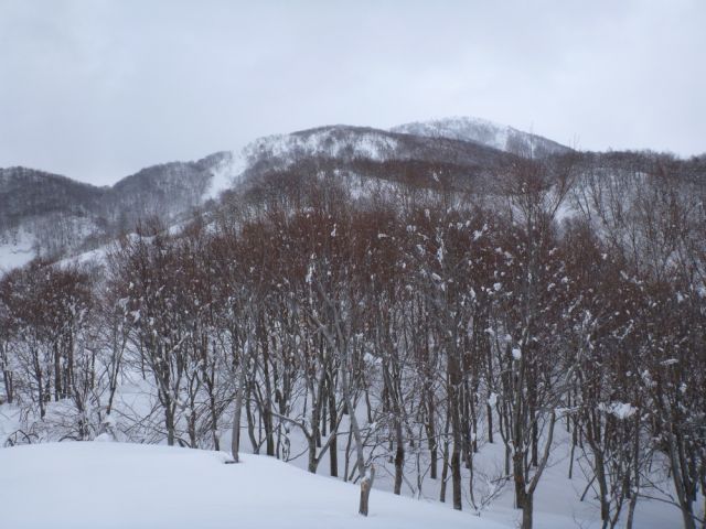 9:20一本杉。雪は、降り止み曇り空になり五頭も見え始めている。新雪は、さほど多くない。トレースが有るので快調に高度を稼ぐ。一王子小屋へ行くトレースから先行者が戻ってくる。小屋でトレースが終わっていたとの事。その方は一王子上のコブまで登ると戻って行った。10:00〜05一王子上コブ(三合目)。独標方向は、見えている。五頭の雲も大分取れてきている。新雪は、10〜20cm位で吹いた様で所々トレースは消えているが、スノーシューはさほど沈まない。四合目の急登も比較的楽に登り切る。