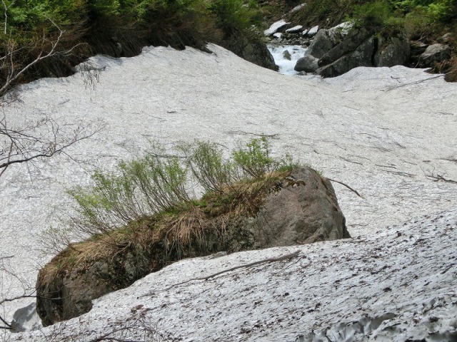 6月恒例の小国山岳会担当の交流行事は天狗平ロッジで行なわれる。9:00集合の酒田市からの参加者が交通事故や片側通行などの影響でだいぶ遅れていた。9:30先発隊が出発する事としてスタートする。11:00うまい水に到着、早速「うまい水」の看板を取り付け、休憩する。11:45地竹原より雪渓に上がることができた。12:00滝沢の出合昼食を取りながら後続を待つ、皇族(後続)は我々より1:00遅れで追いかけている、後続の案内はBPZの親分さんである。12:50後続と合流して、石転び沢出合まで雪渓歩きを楽しむ、途中、コバイケソウが群生していた。
