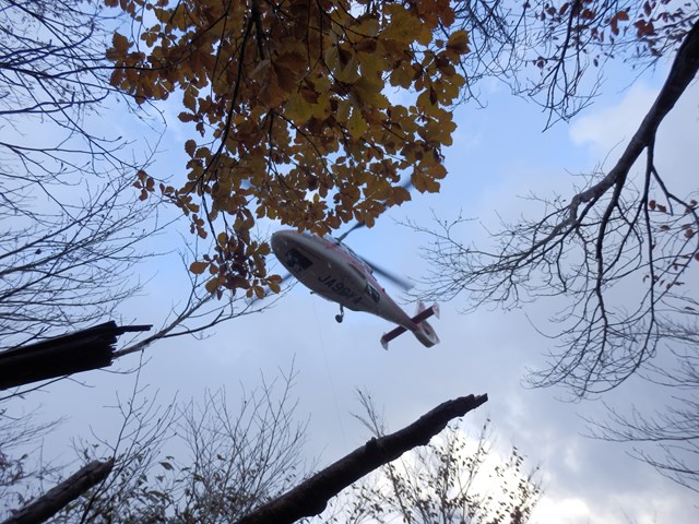 GCS・PWD他1名の計4名で西俣尾根に取り付く。防災ヘリもがみが姿を見せる。無線機から「隊員が1名下降、吊り上げる場所まで要救助者を背負って移動する」との連絡があった。パーティと合流すると、吊り上げの準備が整いヘリを待っているところであった。樹林帯なので空が開けている所がない。ワイヤーが枝に絡まったら大事故になる。かろうじて小さな空の穴で吊り上げるとのことである。ほどなく爆音と共にもがみが到着。要救助者は隊員と共に空に吸い込まれていった。