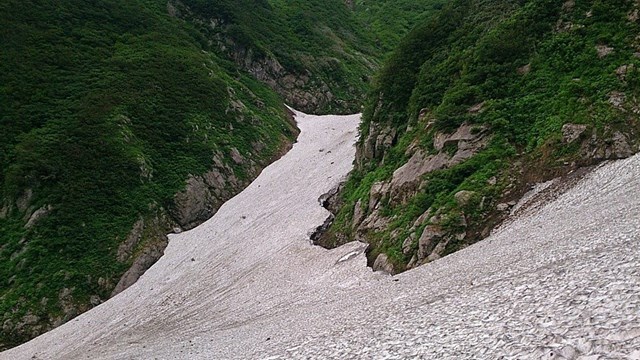 最初は18日の梅花皮小屋風景。次は本日降ってきた石転ビ雪渓です。