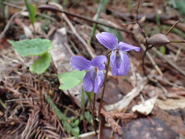 すぐ上に「立石」方面の分岐、続いて「桂集落」方面への分岐があった。「朴坂山・要害山」方面への道は藪化していたが歩けそうだ。イワウチワがわずかに咲いていたが、オオイワカガミの葉のほうが多い。