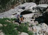 門内沢の雪渓を渡り、石転ビ沢の左岸に入り、再び石転ビ沢を飛石づたいに右岸に移ります。この付近に雪渓はありません。右岸の夏道は暫く進むと草が伸びたため歩きにくいので、川原を進みます。