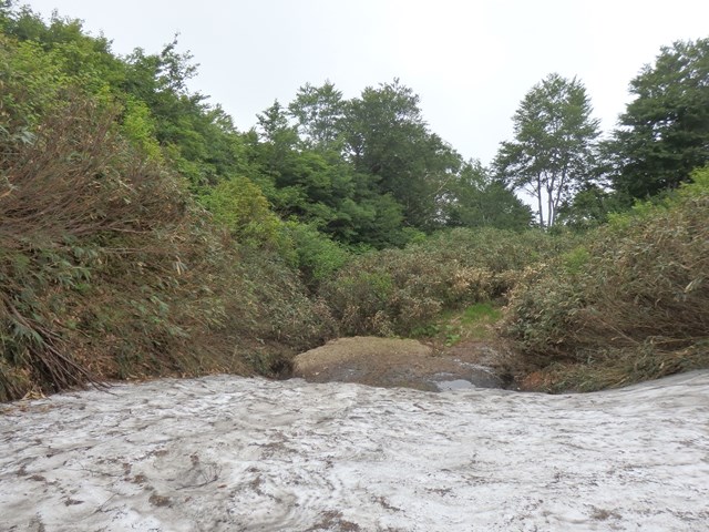 対岸から見て、小屋に突き上げる沢は雪渓が切れていたので、大日杉コース分岐手前まで戻り、11:23下り始める。履物がズックの上に急斜面なのでスプーンカットやキックスッテプだけで不十分と判断。ピッケルでカッティングしながら下る。下まで降り立ってしまえば問題はないが、何時もの年より雪渓が以上に薄く感じる。亀裂はなく、浅い沢なのだが丁寧にルートを選ぶ。沢が露出している手前で右岸の踏み跡に上がるが、始めての人はまず分からないかも知れない。全体としてあと1週間程度で雪渓が歩けなくなると感じた。