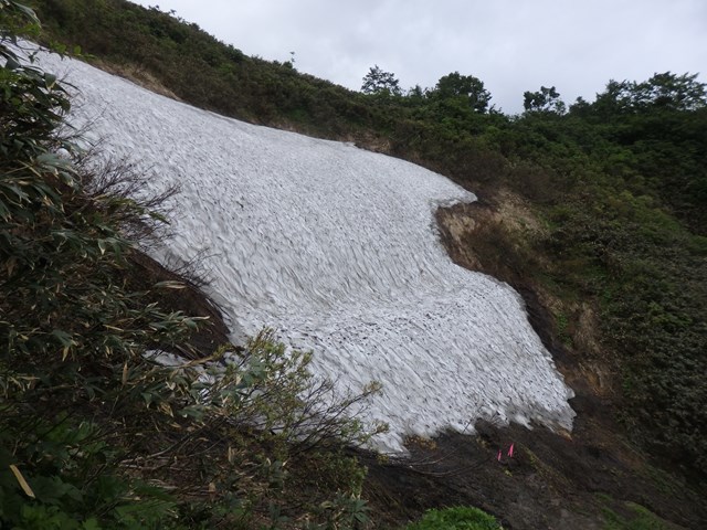 08:33-41、目洗清水に下る道は残雪に覆われている。ピッケルを抜いて慎重に下る。降り1分37秒、戻り2分10秒であった。灌木をつかんでも下れるが滑落注意である。8:42-43水場分岐すぐ先の旧幕営地(分岐に標柱あり)で本山が正面に見える場所。アカモノ・ヒメサユリ・ハクサンシャクナゲ(赤い)・モミジカラマツ・サラサドウダン(終)が咲いている。