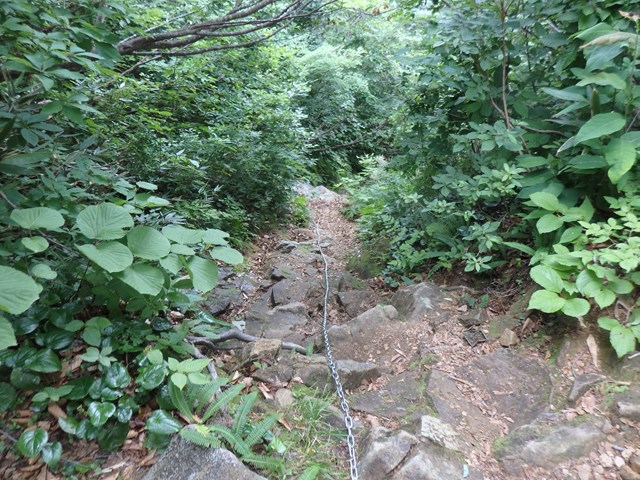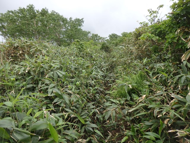 11:45水の流れる小沢を横切り登るが、笹が登山道を覆っている。相当な期間、刈り払っていないようだ。11:48御沢分れ。11:50-20展望台で食事をしながら登山道の問い合わせや山小屋の予約などの対応に時間を費やす。