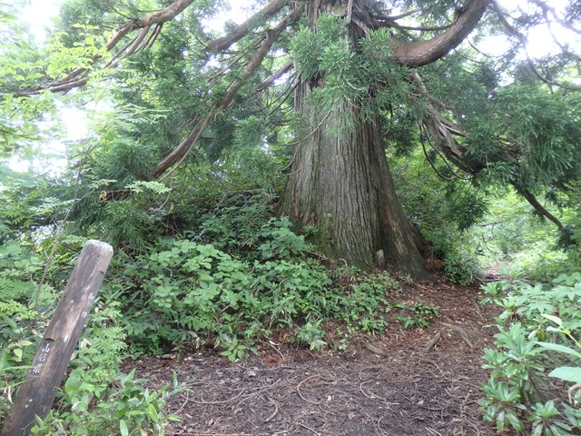 05:40大日杉小屋下の駐車場発。05:52倒木の右手に巻道が作られていた。05:58、ザンゲ坂を登り切る。木を揺らす動物、一瞬身構えるが複数である。サルだろう、これは近くにクマがいないという証拠でもある。山田長之助さんが植えたという「山長の松」のすぐ先は見晴らしが良い。おそらくここは猟の見立場であろう。
