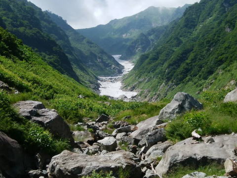 石転ビ沢は、1150mでいったん雪渓にのり、ホン石転ビ沢出合の下部で右手(左岸側)から雪渓をおり、しばらくガレ場歩きになります。ホン石転ビ沢出合の上部で再び雪渓歩き(ここからは軽アイゼンやチェーンアイゼンなどが必要)になります。