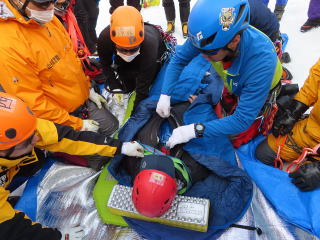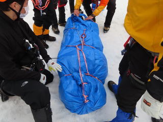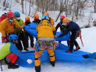 午後からは吉田岳救助隊副隊長をメイン講師にして、北海道方式ラッピングと吊り上げ・吊り下げの研修を行った。