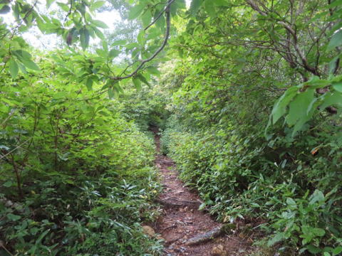 | 山頂を振り返る | 鞍部越しに 右は樽口峠のわらび園 |