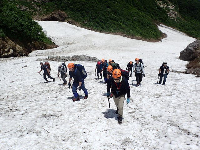 長井警察署・小国警察署・飯豊朝日山岳遭難対策委員会の合同救助訓練が石転ビ沢で実施された。