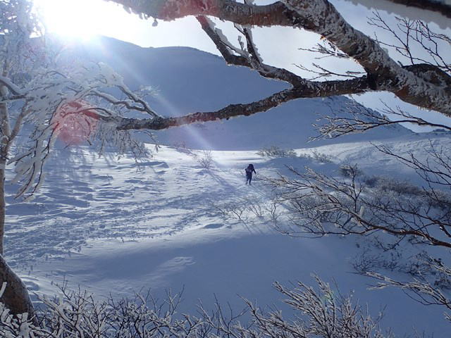 冬の飯豊とは思えないいい天気。青空も顔を出すが、先週の荷上げより雪が少ない。前日に入山した新潟山岳会のトレースを頂きながら、順調に高度を上げる。しかし、暑い。大曲に着く頃には真冬にはあり得ないTシャツで登る。