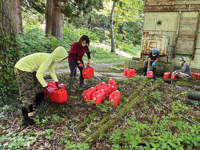 し尿を浄化槽に入れ、ポリタンクを洗って保管します