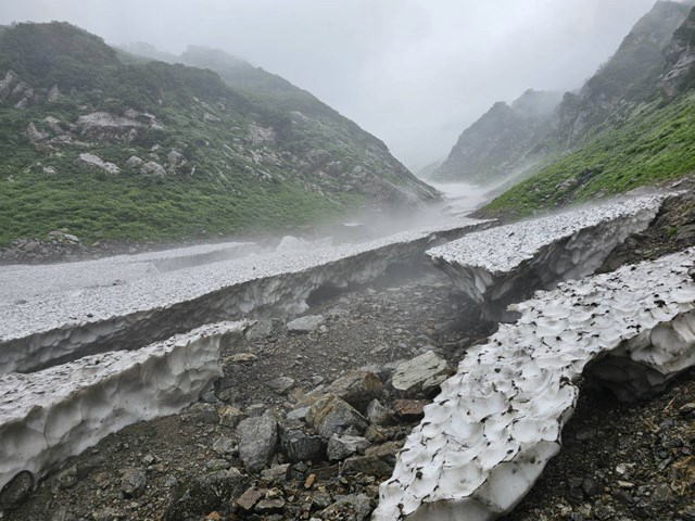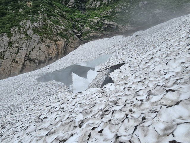 雪渓は不安定で、下は空洞が多数あります。経験があればいいですが、初めてであれば梶川か丸森を登った方が無難です。