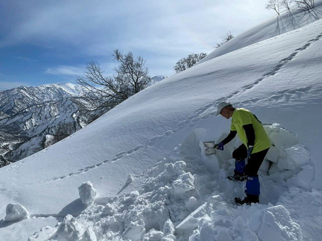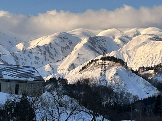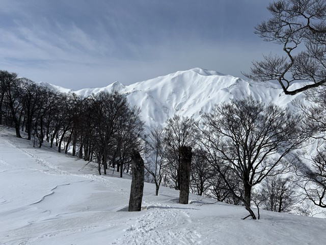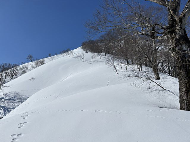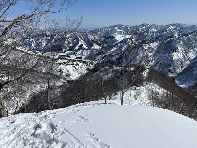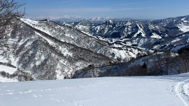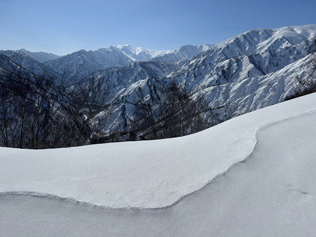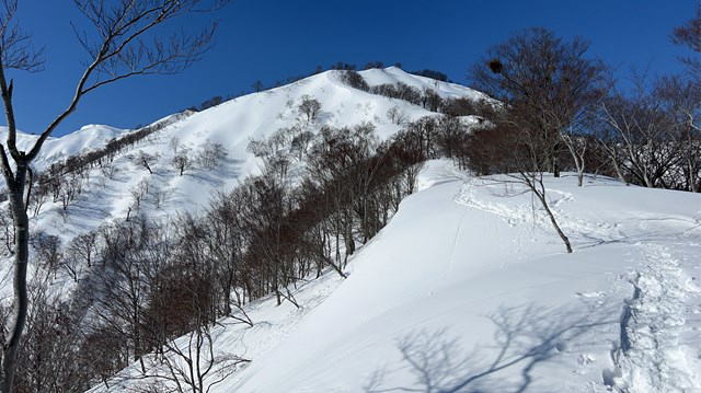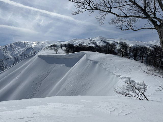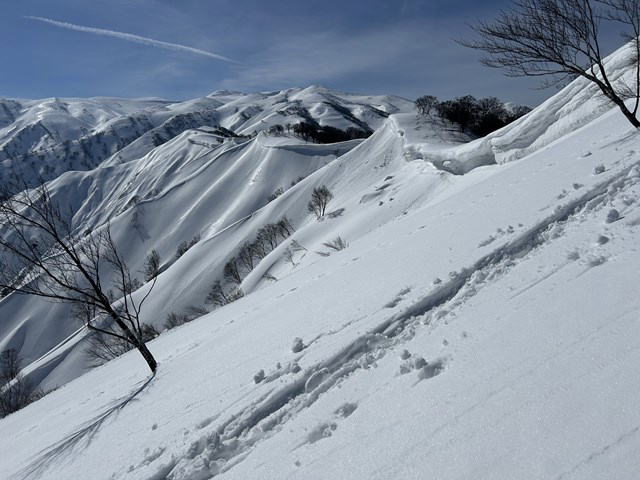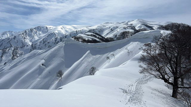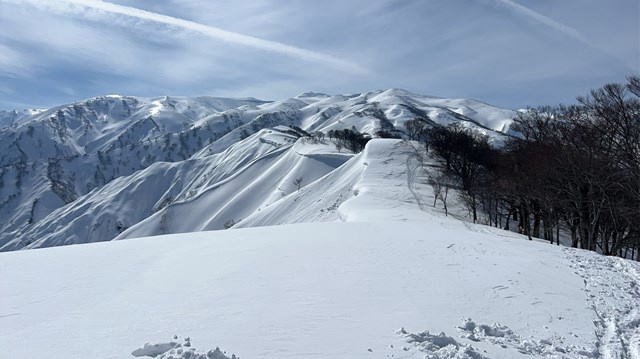 今年は国民宿舎の駐車場は最低限しか除雪されていない。登山者が駐車しては迷惑になる。私達は大淵に駐車することにした。07:12大淵発-07:28民宿奥川入-07:40尾根取り付き-08:25~46大曲-09:28~41十文字ノ池-10:14~30標高850mで休憩-11:11~33西俣ノ峰山頂-11:55~12:06標高1060mから戻る-12:21~50雪洞チームと合流し歓談-13:03~48雪洞弱層訓練-14:06十文字ノ池-14:29~38大曲-15:03ショートカットして尾根取り付き-15:16民宿奥川入で拾い物を預け登山カードを回収-15:33大淵