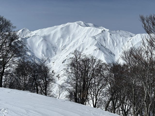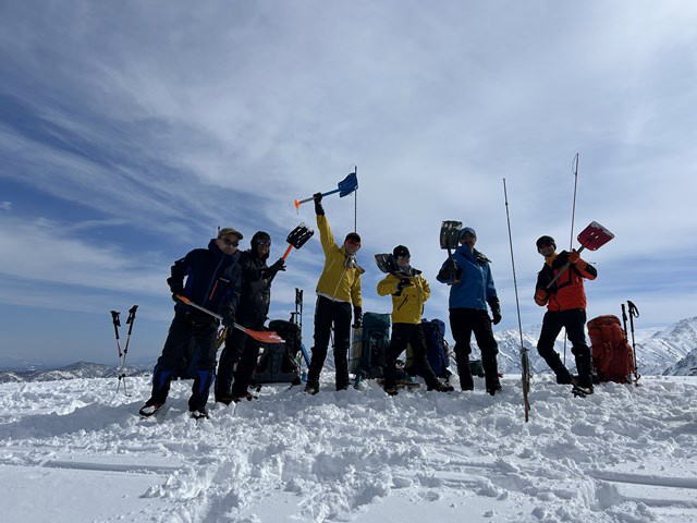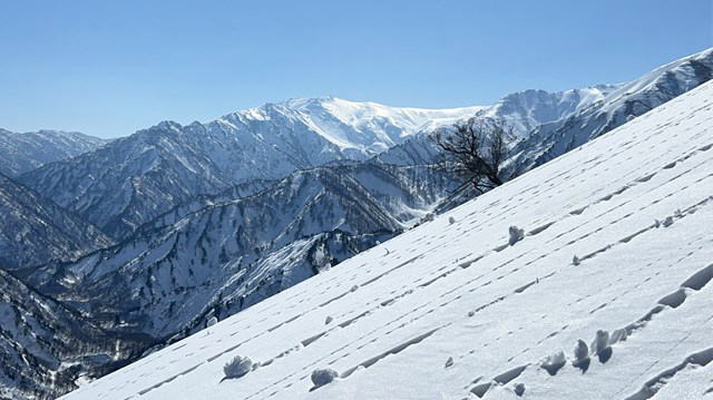 当初は4名の予定であったが、出発前夜に諸事情で1名が欠席となり、高井・小林・井上の3名で出発となった。前日からの素晴らしい快晴で登山者が早朝から入山していた。前夜に大曲で遭難事案が発生していることから、尾根取り付きまでのスノーモービル、さらに大曲までのトレースがしっかりしていることは事前に把握していたが、何と!アイゼンもカンジキも全く使わなかったことが驚きであった。
