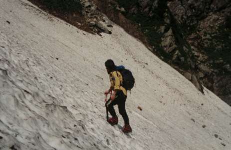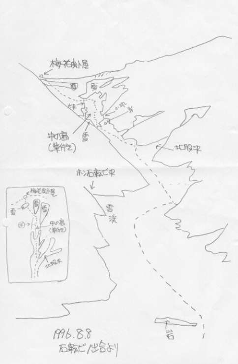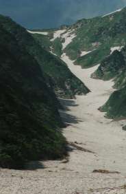 地竹原の慰霊費を通り過ぎてまもなく、雪渓の上に上がる。ここから中ノ島(草付き)までの雪渓で薄くなったり亀裂が入っているところは見あたらない。滝沢は梅花皮大滝まで雪渓が続いている。梶川は雪渓がないが、本流を歩く分には全く問題ない。梶川出合のすぐ上左岸の水場は使用可能。石転ビノ出合には手前左岸の岩と合流点から若干石転ビ沢に入った平らな岩が露出した。門内沢にも雪渓が続いており、足元ばかり見ていると、迷い込む恐れがある。ホン石転ビ沢も雪渓が続いており、ホン石転ビ沢からの落石の恐れは残っている。ホン石転ビ沢対岸(左岸)の水場は使用できる。ホン石転ビ沢手前から上は全て落石の恐れがある。ホン石転ビ沢出合から傾斜がきつくなるのでアイゼンを付けるのがよい。北股沢出合の水場はまだ雪に埋もれている。北股沢は右俣左俣ともに雪が多く、落石が発生する恐れは残っている。黒滝は全く雪の下であり、できるだけ早く中ノ島(草付き)に上がってアイゼンを外すのが良い。中ノ島(草付き)の両側の雪渓は暫く上部で途切れる。中ノ島(草付き)途中の左手(下から見て)の水場使用できるが、右手には近づかないこと。中ノ島(草付き)の上部で左手の小沢を横切り 沢状の登山道を直登するのだが、小沢を横切らないでそのまま直登する踏み跡があり、今回も誤って入り込み上部の雪渓で四苦八苦しているパーティがいたので注意すること。沢状の登山道を登りきると眼前に梅花皮小屋が現れる。ここの融雪水は飲ま