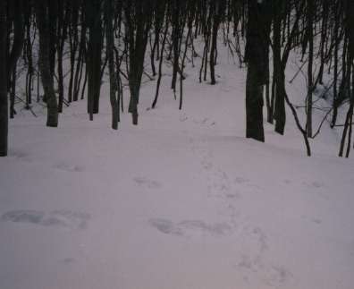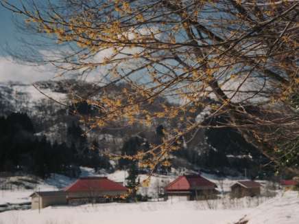 マルバマンサクが綻び始めました。水路沿いにはフキノトウも顔をのぞかせていました。若いブナ林の中に、沢山の兎に踏み固められた道が雪の上に続いていました。