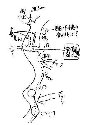 年だと落合付近の雪渓は6月中旬頃まで安定しているものだが、今年は落合から上方に150m程進むと、幅5m位で端から端まで雪渓が崩壊している。進めないからしかたなく地竹の丘に一旦あがって夏道に向かうが、今度は登り口に浮いている残雪が数カ所あって危険、全く前に進めなくて引き返す羽目になった。その場所から対岸を眺めると、去年は遅くまでばんとしていた滝沢が既にあき始め、3m位白い滝が見えた。この地域、あと2〜3週間は雪崩が頻繁に発生するだろうから、今が一番ルートが取りにくく、登山道の安定にしばらくかかりそうだ。