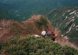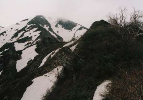 鞍部へ下り岩を右から巻く、左手に雪も残りビバークに最適なところだ。ODDと交信した直後、雨が降って視界もなくなってきた。ダケカンバの生育する右斜面には季節風により見事に刈り込まれた快適な部分が断続的に続き、ピッチが上がる。