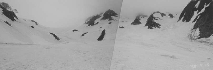 09:27〜3316,163歩、石転ビノ出合。コース上では、ここまで雪崩の恐怖感は殆ど感じられない。石転ビ沢を仰ぐと、手前の大石と奥のテーブル状大石が露出していた。本当に雪が少ない。