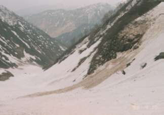 登る時はなかった雪崩跡を見る。右岸壁で雪塊が崩壊したもので、雪渓の半分を覆っていた。