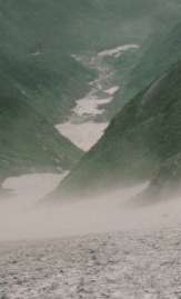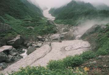 雪渓に上がったら右岸沿いに歩く、左岸沿いは陥没の恐れがある、ただし右岸沿いも薄くなっているところがあるから要注意。途中で雪渓が切れている所は踏み跡もないので、適当に川原を進む。右岸から入ってくる小沢を過ぎて再び雪渓に上がる。05:45ホン石転ビ沢の雪渓は合流点上で途切れている。対岸(左岸)の小沢で水を利用する時は、雪渓が薄くなっているので慎重にルートを選ぶこと。岸壁にはニッコウキスゲやオタカラコウが鮮やかに揺れていた。