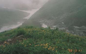 04:57〜05:08石転ビノ出合着、梅花皮小屋と交信。門内沢と石転ビ沢の合流点下流には両岸に若干の雪渓残があり近寄れない。門内沢の雪渓も後退しており近づける雰囲気ではない。門内沢を飛び石伝いにジャンプして右岸に移り、他にルートがなかったので嫌嫌ながら雪渓を素早く潜り抜ける。さらに石転ビ沢を飛び石伝いにジャンプして右岸の踏み跡に出る。登山道の道脇にはミヤマキンポウゲが咲いていた。雪渓の状態は、エアリアマップ裏図「8月下旬」に相当する。ただ石転ビノ出合の通過方法は8月中旬のルートのほうが良い。
