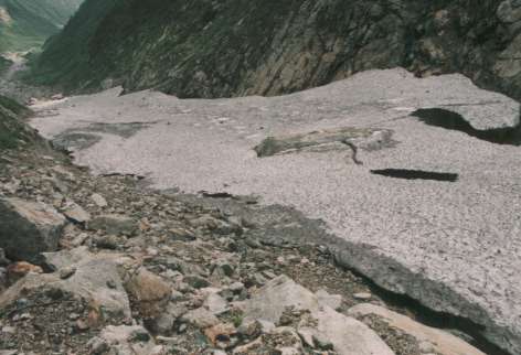 右岸側(以前に近畿大生が転落死亡した所)の雪渓はズタズタとなっている。そのままガレ場をトラバースするように進む。浮き石の急斜面なので、慎重にルート選定する。部分的に雪渓を歩ける部分があるが、厚さを頻繁に確認する必要がある。ホン石転ビ沢出合と北股沢出合の中程で雪渓が途切れる。ひたすらガレ場のトラバースを行い、雪渓に上がるがすぐにまた雪渓が途切れる。