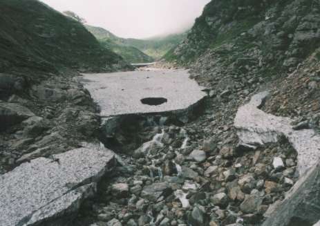 石転ビノ出合はスパイク地下足袋を脱いで門内沢を渡り、07:25〜40朝食とする。飛び石伝いに石転ビ沢を渡り、右岸の踏み跡を辿る。石転ビノ出合からホン石転ビ沢までの間2/3右岸に岸壁が出てくる所で、右岸から雪渓に上がる。亀裂に注意しながら左岸沿いに登り、08:19ホン石転ビ沢対岸の枝沢に出る。
